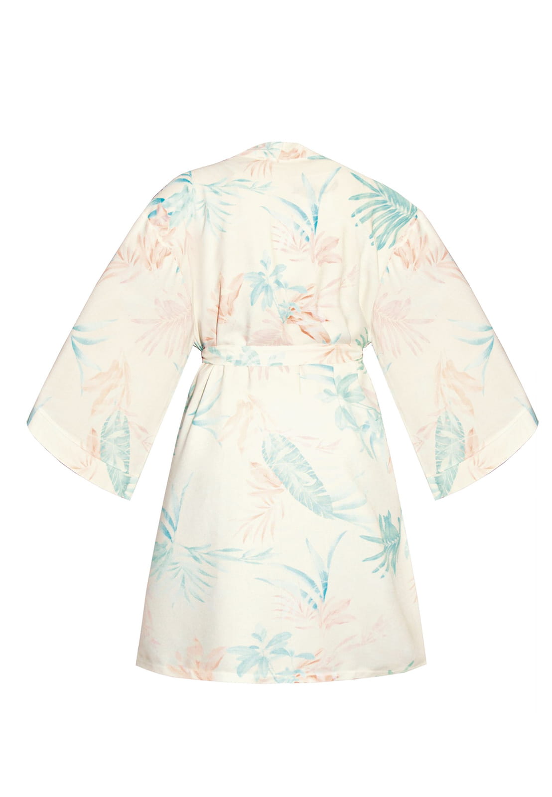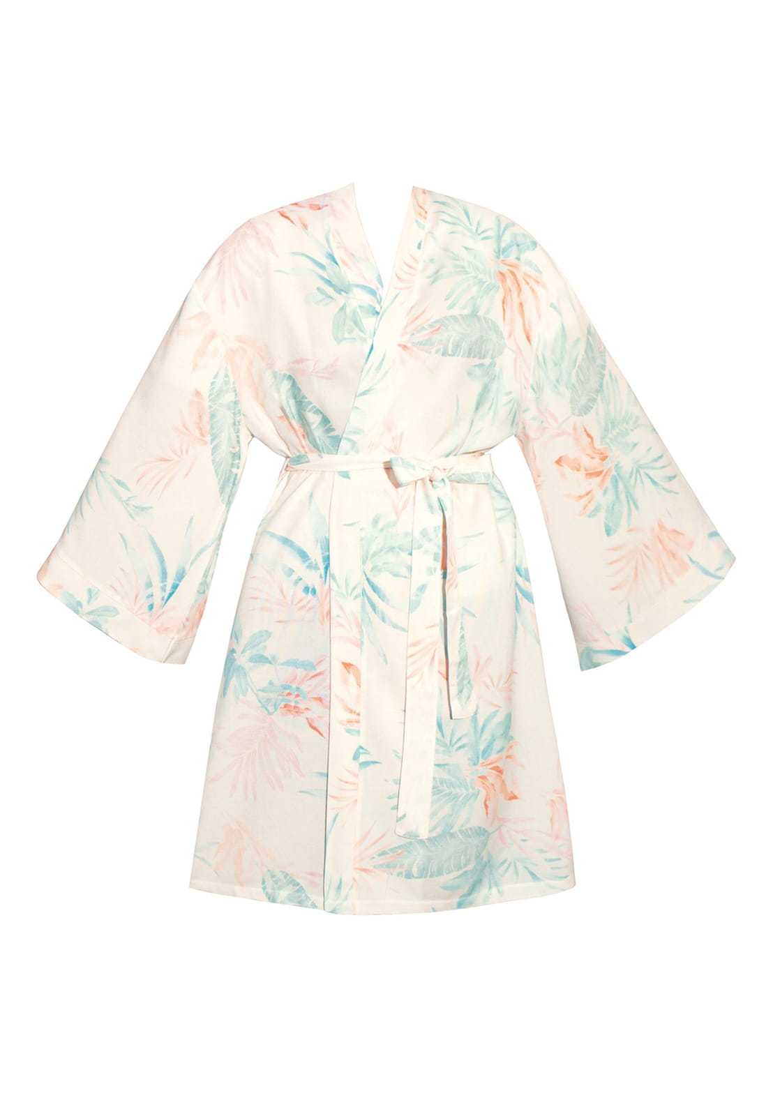Ten subtelny szlafroczek o rozkloszowanych rękawach i przewiązywany paskiem w talii dodaje sylwetce lekkości, a print w formie bambusowych motywów podkreśla naturalny, harmonijny charakter materiału.