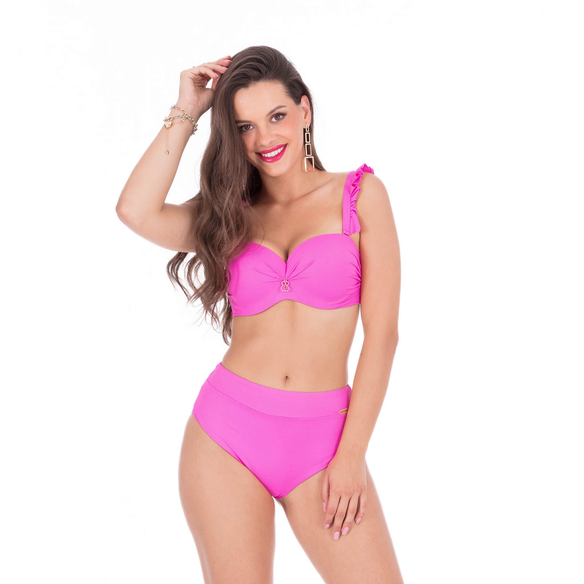 Kostium kąpielowy Brigitt B v.M składa się z dwóch części. Biustonosz typu push-up genialnie podkreśla biust, a wyjmowana wkładka pozwala na dopasowanie go do różnych rozmiarów piersi. Fiszbiny, zamieszczone w miękkiej kieszonce, zapewniają komfort nawet najbardziej wrażliwym obszarom ciała. Ozdobna falbanka dodaje kokieterii, a regulowane ramiączka pozwalają na idealne dopasowanie do sylwetki. Wygodne zapięcie na zatrzask z tyłu biustonosza gwarantuje, że strój będzie bezpieczny nawet podczas aktywnego wypoczynku.